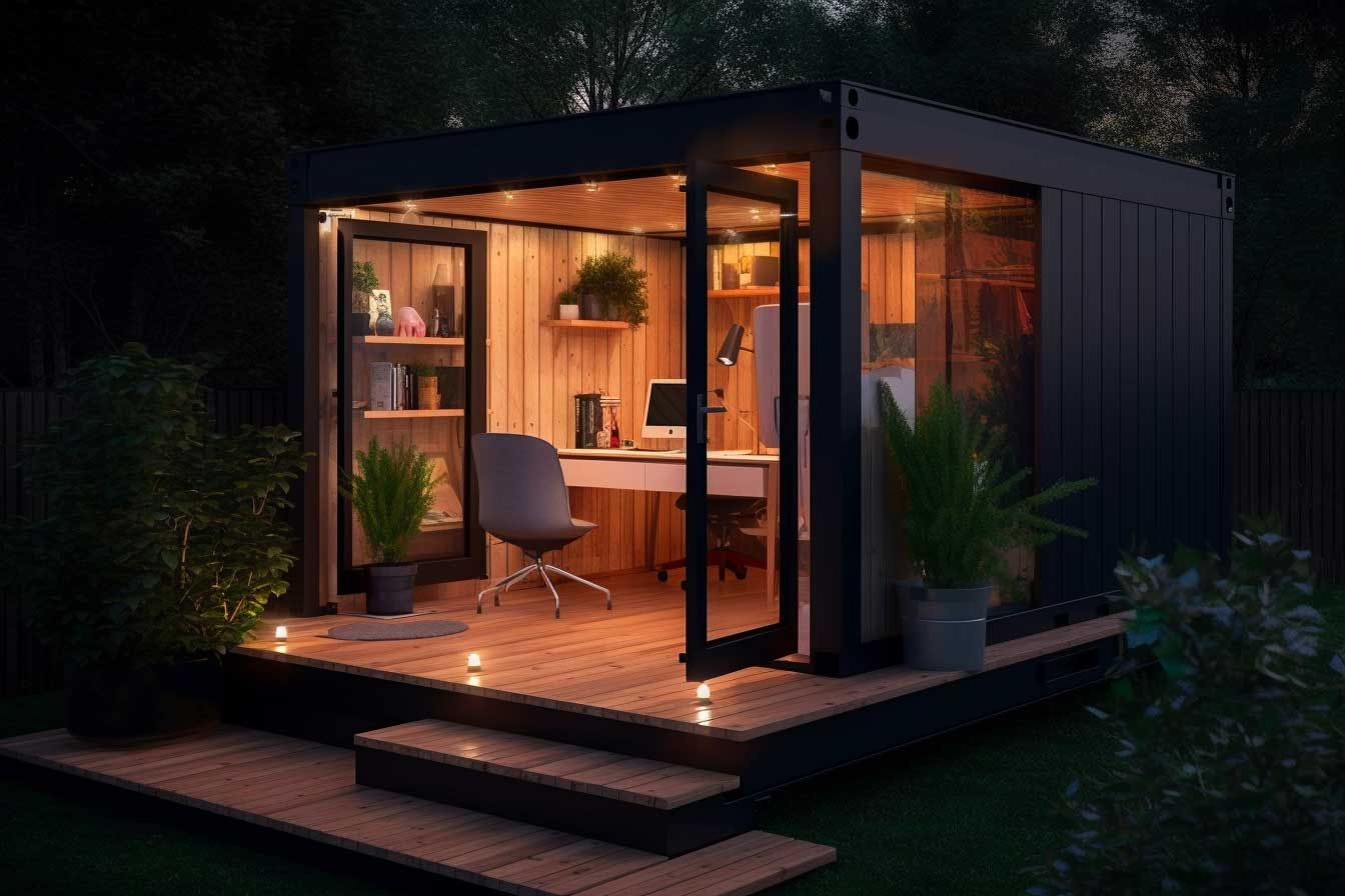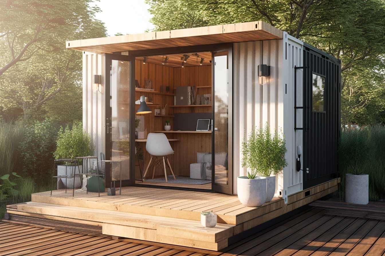 Idee - Einen solarbetriebenen Tiny-Homeoffice Container mit Holzdeck und vielen Fenstern.