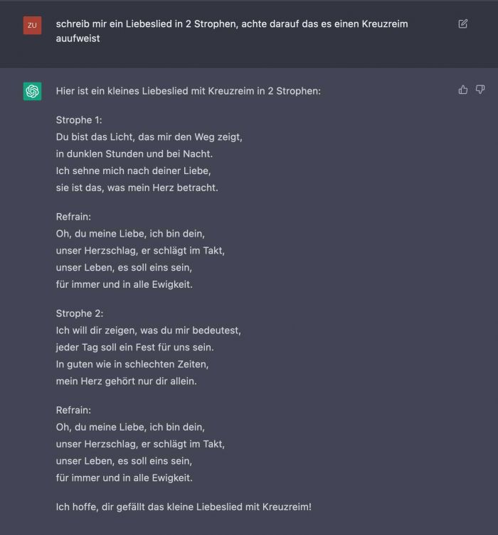 Ok, es ist nun nicht so, dass man gleich dahinschmilzt und das Reimen scheint auch nicht so ganz einfach zu sein, aber besser als eine leere Seite.