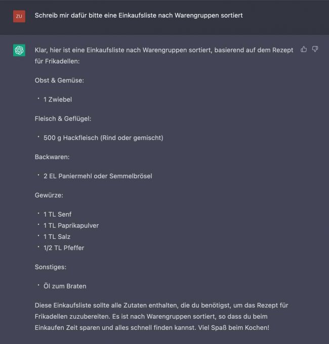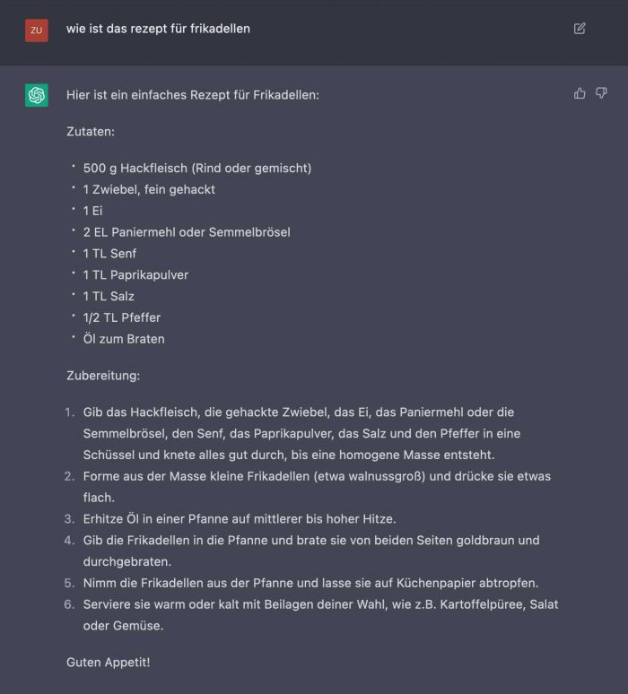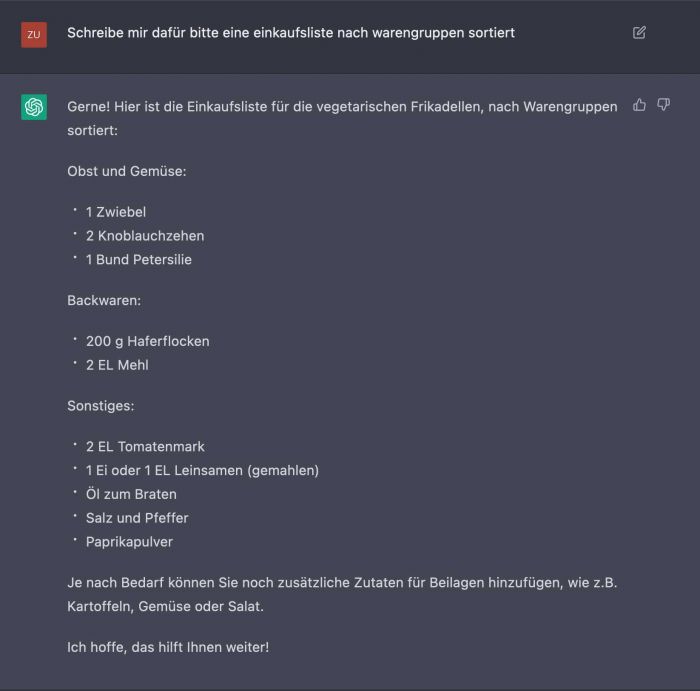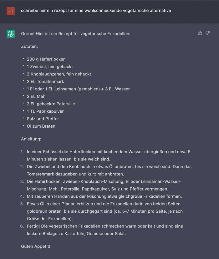 Auch kein Problem ChatGPT erzeugt schnell und ohne meckern eine vegetarische Alternative.