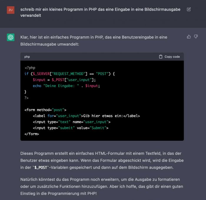 Das Beispiel hier ist PHP, ich kann ebenso in Perl, C#, HTML oder was weiß ich noch programmieren. Ich kann auch fertigen Programmcode in ChatGPT einlesen lassen und ihn einfach nur eine Dokumentation dazu schreiben lassen.